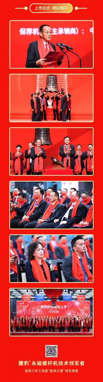 中信证券股份有限公司董事总经理叶新江先生在致辞中表示:东亚机械是国内空气压缩机领域的领军企业。经过30年的深耕,东亚机械培育出国产品质空气压缩机品牌——“捷豹”,受到国内外众多企业用户的信赖;打造了覆盖全国、面向全球的经销商体系,为“捷豹”用户提供专业、及时的售后服务;入选工信部“能效之星”目录的产品数量位居行业榜一,为节能减排做出了重要贡献。随着上市钟声的敲响,东亚机械将开启发展新征程。衷心祝愿公司能够牢牢把握登陆资本市场的良好机遇,不断提升综合实力,力争成为空气动力领域受信赖的企业!